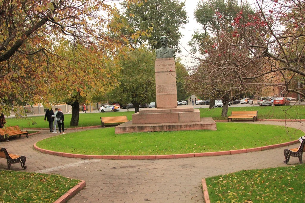 Тимирязев Климент Аркадьевич — один из крупнейших российских учёных, основоположник отечественной школы физиологии растений и научной агрономии. Его фундаментальные работы в области изучения фотосинтеза, физиологии растений и биохимии оказали глубокое влияние на развитие биологии и сельского хозяйства. В 1880 г. он стал профессором Московского университета и членом-корреспондентом Российской академии наук. Художественное решение памятника отличается сдержанной выразительностью. Бюст выполнен из бронзы и изображает учёного в профиль. Лицо Тимирязева передано с внимательной и сосредоточенной выразительностью, что позволило скульпторам воплотить его интеллектуальную мощь и преданность научному труду. Четкая и строгая, но при этом гуманная черта характера учёного читается в деталях: в моделировке костюма, выражении глаз и общей пластике. Использование бронзы обеспечило высокую реалистичность и детализацию. Постамент из натурального камня придает композиции солидность и монументальность, соответствующие статусу Тимирязева. Задний план или элементы постамента часто включают декоративные растительные орнаменты, символически указывающие на связь учёного с миром живой природы, агрономией и биологией. Социальное значение памятника выходит за рамки исключительно научной сферы. Он олицетворяет глубокое уважение к интеллектуальному труду и разуму, служит напоминанием о непреходящей ценности фундаментального знания и образования для прогресса общества. Таким образом, монумент К.А. Тимирязеву является не только данью памяти конкретному учёному, но и символом признания социальной значимости науки в жизни страны. Памятник К.А. Тимирязеву установлен в Москве на Тимирязевской улице дом 49. Монумент, представляющий собой бронзовый бюст учёного на каменном постаменте установлен в 1929 г. на территории парка Московской сельскохозяйственной академии. Авторами проекта являются скульптор Мария Страховская и архитектор Сергей Чернышёв.