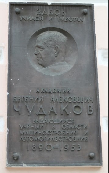 Евгений Алексеевич Чудаков – советский учёный и педагог, специалист в области машиноведения и автомобильной техники, академик АН СССР. Лауреат двух Сталинских премий второй степени (1943, 1951 гг.). Родился в Тульской Губернии в селе Сергиевское. В середине 1918 г., он вошел в ВСНХ с предложением о создании научно-исследовательской организации по автомобилям. Эта инициатива была одобрена, и в ноябре того же года группа специалистов под руководством Евгения Алексеевича Чудакова организовала при ВСНХ Научную автомобильную лабораторию (НАЛ). В 1921 г. на базе лаборатории был создан Научный автомоторный институт (НАМИ), который начал разрабатывать актуальные проблемы автомобильной и автомоторной техники: проектирование новых конструкций автомобилей и двигателей, исследование применяемых материалов и т. д. Во все время деятельности НАМИ Е.А. Чудаков был одним из его руководителей – заместителем директора по научной части. Осуществленные Е.А. Чудаковым в НАЛ и НАМИ теоретические и экспериментальные работы послужили базой для создания новой научной дисциплины – теории автомобиля. Евгений Алексеевич Чудаков первым начал вести курсы по автомобилям в МВТУ и там же организовал специализированную кафедру. С 1932 г., когда в Москве была открыта Военная академия механизации и моторизации Красной Армии, Евгений Алексеевич Чудаков в течение десяти лет возглавлял в академии кафедру автомобилей. После избрания Е.А. Чудакова членом-корреспондентом в 1933 г., а затем действительным членом АН СССР в 1939 г., его научная деятельность значительно расширилась и переросла рамки автомобилестроения. Он занимается общими вопросами развития машиностроения и машиноведения, изучением производительных сил страны, проблемами организации науки. Ко времени переезда в Москву АН СССР относится его энергичная деятельность по организации и руководству Комиссией машиноведения (1935-1938 гг.), по созданию академического Института машиноведения, директором которого он стал с первого дня его создания. Е.А. Чудаков более трех лет выполнял обязанности вице-президента Академии наук и во многом способствовал дальнейшему развитию технических наук в Академии, внедрению научных достижений в практику народного хозяйства. Будучи членом Совета научно-технической экспертизы Госплана СССР, он принимал активное участие в составлении и реализации планов внедрения новой техники в различные отрасли машиностроения. В 1944 г. Е.А. Чудаков возглавил Редакционный совет по изданию первого в стране энциклопедического справочника «Машиностроение». Это фундаментальное 15-томное издание было осуществлено в рекордно короткий срок — за несколько лет. Дважды – в 1943 и в 1951 гг. – Е.А. Чудакову за крупные научные работы в области машиностроения присуждались Сталинские премии СССР. Также он был награжден двумя орденами Ленина, орденом Трудового Красного Знамени, медалями.