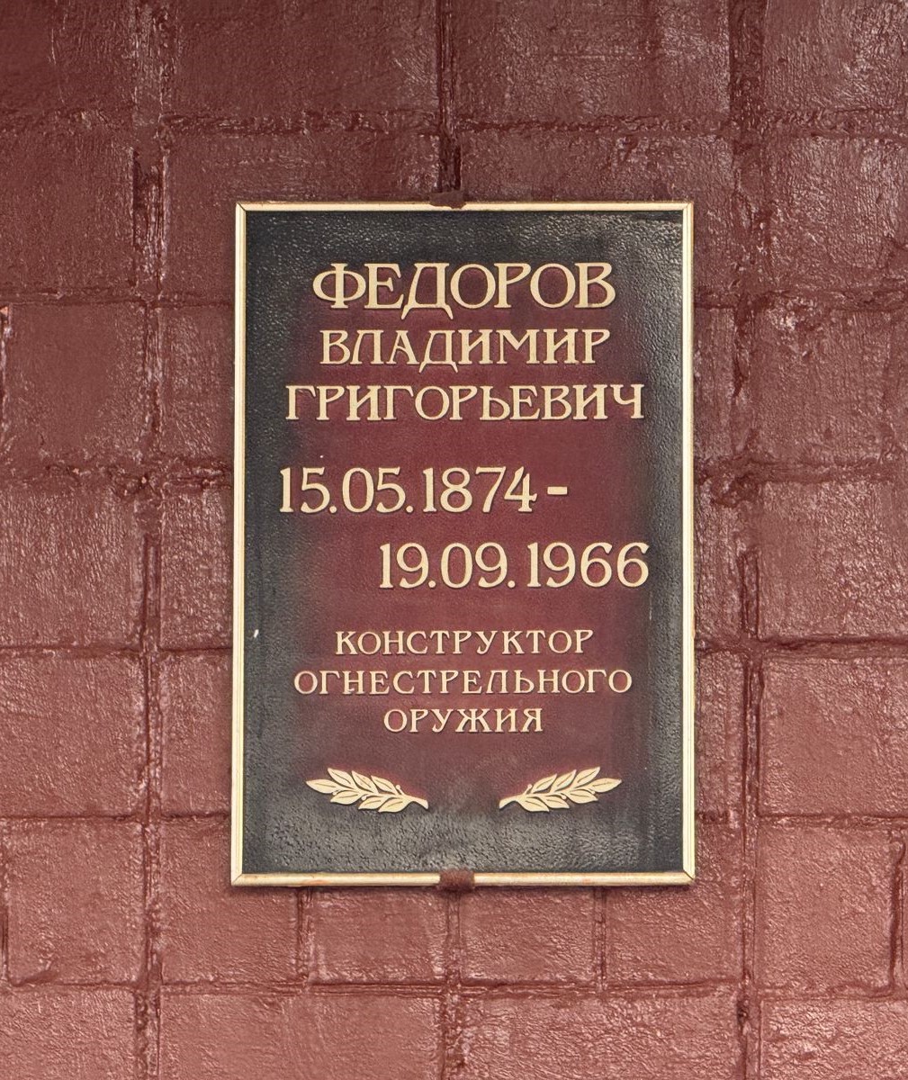 Фёдоров Владимир Григорьевич – русский и советский конструктор стрелкового оружия, генерал-лейтенант инженерно-технической службы (1943), академик Академии артиллерийских наук (1946), профессор (1941), доктор технических наук (1940), Герой Труда (1928). Выпускник престижных Михайловского артиллерийского училища и артиллерийской академии, Фёдоров начинал свою карьеру как артиллерист. Однако, судьбоносная встреча с выдающимся конструктором Сергеем Ивановичем Мосиным во время прохождения производственной практики на Сестрорецком оружейном заводе кардинально изменила его жизнь, пробудив неподдельный интерес к стрелковому оружию. Уже в начале XX века конструкторский гений Фёдорова начал проявляться в полной мере. В 1906 г. он представил на суд оружейных специалистов первую в России автоматическую винтовку, разработанную на базе знаменитой «трёхлинейки» Мосина. Следующим новаторским шагом стала разработка оригинального патрона калибра 6,5 мм (1913), который по своей концепции предвосхитил появление промежуточного патрона, получившего широкое распространение и ставшего стандартом значительно позже. Наиболее значительным достижением Фёдорова, безусловно, является создание в 1916 г. первого в мире автомата, который в то время назывался «ружьём-пулемётом», под разработанный им же 6,5-мм патрон. Это оружие, оснащённое магазином на 25 патронов, стало настоящим прорывом в оружейном деле, однако его широкое боевое применение было ограничено событиями революции и последовавшей за ней Гражданской войной. Фёдоров был не только талантливым конструктором, но и выдающимся организатором. В 1921 г. он основал первое в стране специализированное проектно-конструкторское бюро по разработке стрелкового оружия, тем самым заложив основу для системной работы целых коллективов над созданием новых образцов. Среди его учеников и соратников были такие впоследствии прославленные советские оружейники, как Дегтярёв, Шпагин и Симонов. Вклад Владимира Григорьевича Фёдорова в развитие отечественного оружейного дела был по достоинству оценен. Он был удостоен звания Героя Труда, стал лауреатом престижной Михайловской премии, доктором технических наук и генерал-лейтенантом. В годы Великой Отечественной войны Фёдоров активно выступал в качестве консультанта, являясь живым связующим звеном между поколениями оружейников. Его концепция лёгкого автоматического оружия пехоты, сформулированная в начале XX века, оказала определяющее влияние на развитие военной мысли во всем мире. В этом заключается его главное и неоспоримое наследие. В знак глубокого уважения и признания заслуг Владимира Григорьевича Фёдорова в Москве, в районе Южное Тушино, на доме №33 по улице Свободы, установлена мемориальная доска, увековечивающая его память.
