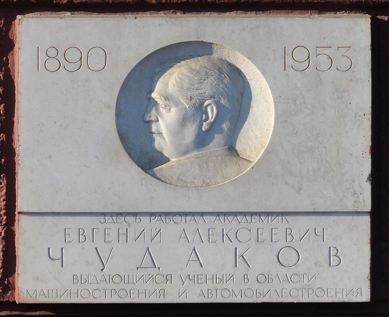 Чудаков Евгений Алексеевич – советский учёный и педагог, крупный специалист в области машиноведения и автомобильной техники, академик АН СССР, лауреат двух Сталинских премий второй степени (1943, 1951). Родился в селе Сергиевском Тульской губернии. В середине 1918 г. он выступил в Высшем совете народного хозяйства (ВСНХ) с инициативой о создании специализированной научно-исследовательской организации для автомобильной отрасли. Предложение получило поддержку, и уже в ноябре того же года группа специалистов под руководством Чудакова организовала при ВСНХ Научную автомобильную лабораторию (НАЛ). На её базе в 1921 г. был создан Научный автомоторный институт (НАМИ), занявшийся решением ключевых задач автомобилестроения: проектированием новых моделей автомобилей и двигателей, исследованием материалов и технологий. На всём протяжении деятельности НАМИ Евгений Алексеевич являлся одним из его руководителей, занимая пост заместителя директора по научной работе. Теоретические и экспериментальные исследования, проведённые Чудаковым в НАЛ и НАМИ, легли в основу новой научной дисциплины — теории автомобиля. Он первым начал читать курсы по автомобилестроению в Московском высшем техническом училище (МВТУ), где также организовал профильную кафедру. С 1932 г., после открытия в Москве Военной академии механизации и моторизации РККА, в течение десяти лет возглавлял в ней кафедру автомобилей. После избрания членом-корреспондентом (1933 г.), а затем и действительным членом АН СССР (1939 г.) научная деятельность Чудакова значительно расширилась, выйдя за рамки автомобильной тематики. Он занялся общими вопросами развития машиностроения и машиноведения, изучением производительных сил страны, проблемами организации науки. В период переезда АН СССР в Москву он активно участвовал в организации и руководстве Комиссией машиноведения (1935-1938 гг.), а также в создании академического Института машиноведения, директором которого стал с момента его основания. Более трёх лет Чудаков исполнял обязанности вице-президента Академии наук, внося значительный вклад в развитие технических наук и внедрение научных достижений в народное хозяйство. Будучи членом Совета научно-технической экспертизы Госплана СССР, он активно участвовал в разработке и реализации планов по внедрению новой техники в различные отрасли машиностроения. В 1944 г. Евгений Алексеевич возглавил Редакционный совет по подготовке первого в стране энциклопедического справочника «Машиностроение». Это фундаментальное 15-томное издание было подготовлено в рекордно короткие сроки — всего за несколько лет. За крупные научные работы в области машиностроения Е.А. Чудаков дважды удостаивался Сталинской премии (1943 г., 1951 г.). Также он был награждён двумя орденами Ленина, орденом Трудового Красного Знамени и медалями.
